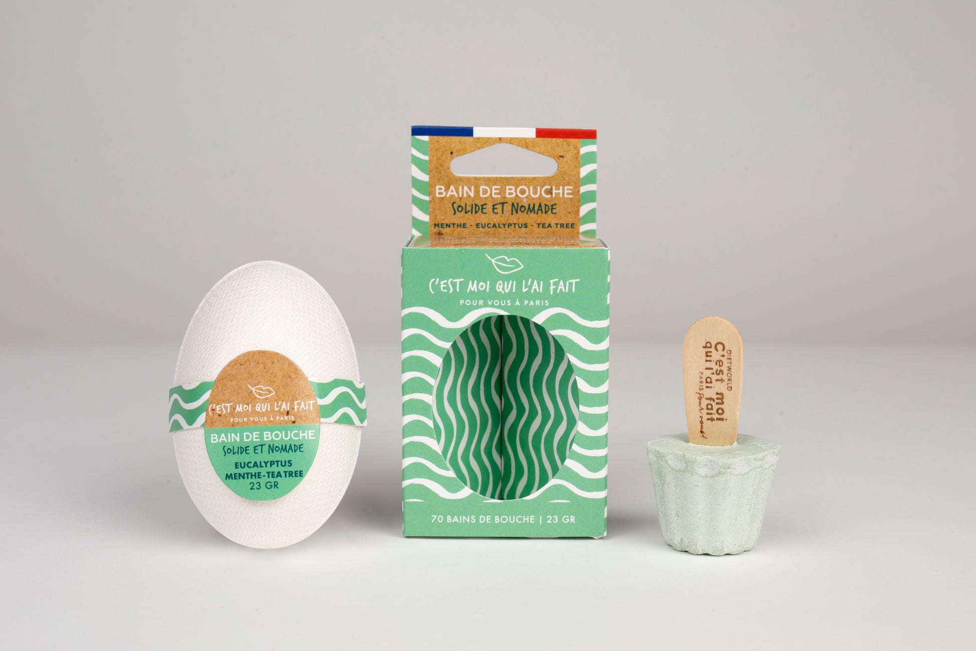 La coque qui abrite la sucette est en pulpe de canne alimentaire. Elle est résistante, biodégradable et hygiénique. En utilisation nomade l'une des coques peut être utilisée comme récipient et doseur puisque remplie, elle contiendra assez d'eau pour réaliser votre bain de bouche.
