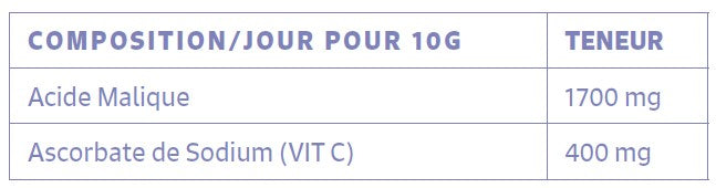 Ingrédients : Maltodextrine (agent de charge), Acide malique, Acide Ascorbique.